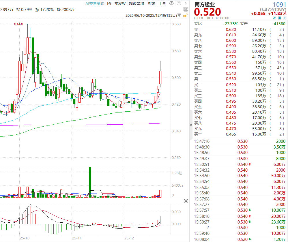 【环球网财经综合报道】进入12月,小金属电解锰市场迎来了一场强劲的涨价风暴。多个方面数据显示,电解锰价格已连续13个交易日上涨,累计涨幅近15%,最新均价攀升至17820元/吨,创下自2022年5月以来的三年多新高。